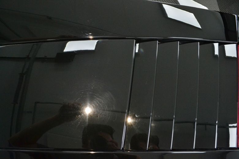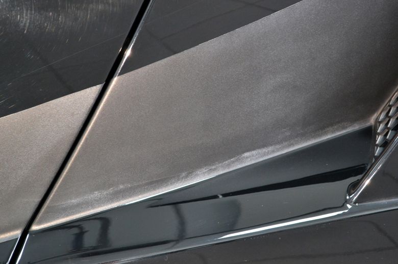 Een dergelijke sportauto als deze is geen beginnersauto om aan te werken. Non metallic zwart is in de regel eigenlijk altijd al een stuk moeilijker dan alle andere tinten. Een rechte deur gaat nog wel, maar deze auto heeft zo veel hoekjes, inhammen, naden, kleine delen en ga zo maar door dat effectief correctiewerk een flinke uitdaging vormt. Als je je dan nog eens realiseert dat alle delen van carbon of kunststof zijn, beide met een hele hoge c.q. snelle opwarmingscurve, en dan zonder dat de lak meetbaar is op deze ondergronden daar er geen puls terugkomt, dan zul je begrijpen dat dit een professionele opdracht is om alles correct te verzorgen.